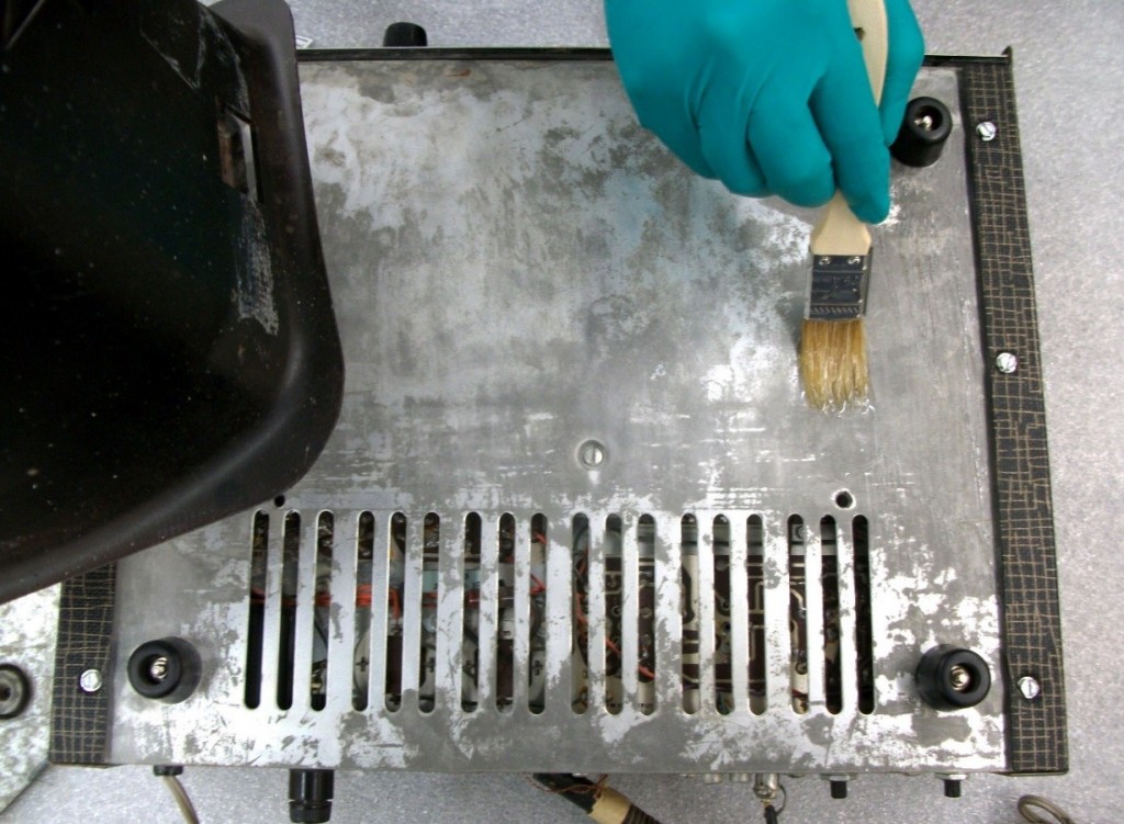 Once the object is placed inside the filtered box, the corrosion is removed with a fiberglass brush while utilizing the box’s interior gloves. To slow the formation of any further corrosion, the metal is coated with a 20% Acryloid B72 that has been dissolved in acetone and toluene.