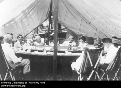 Between 1915 and 1924, Henry Ford, Thomas Edison, tire magnate Harvey Firestone and naturalist John Burroughs (who took part 1916-1920), calling themselves "the Four Vagabonds," embarked on a series of summer camping trips. Others joined the group at various times, among them family, business associates and politicians, including U.S. presidents. (Photo found here.)