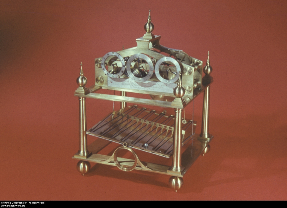 The collections of The Henry Ford contain hundreds of clocks. Many of these are on display, either in the Clockwork exhibit in the Henry Ford Museum or as part of the recreation of daily life in the buildings of Greenfield Village, but many more are not. We’ve just added a number of clocks, dating from the late 17th through mid-20th centuries, to our digital collections, bringing the total number online to about 120. More than half of these are not currently on display, including this early 19th century novelty clock, which keeps time by rolling a steel ball down a zigzag track. Visit our online collections to view our growing digital collection of clocks and related artifacts.