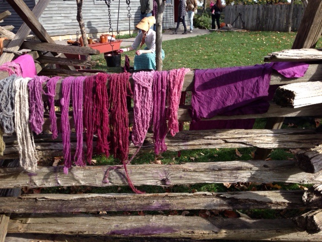 It was crisp morning at the far end of the Village when I came in to work on a Sunday last month, sunshine hitting the fallen leaves and brightening up the inside of the 1760 Daggett Farmhouse. It was a perfect day for wool dyeing in the way of the colonial time period, and just about the time of year that Anna Daggett herself may have had some time to experiment with colors.