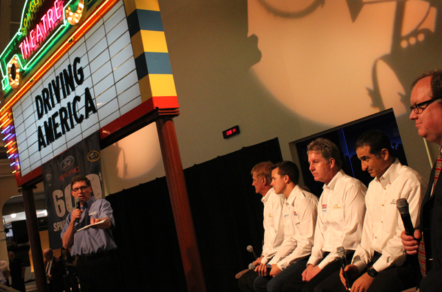 Michigan International Speedway president Roger Curtis leads a fan Q & A with Eddie Wood, Trevor Bayne, Len Wood, Ford Racing's Jamie Allison, and The Henry Ford executive vice president Christian Overland.