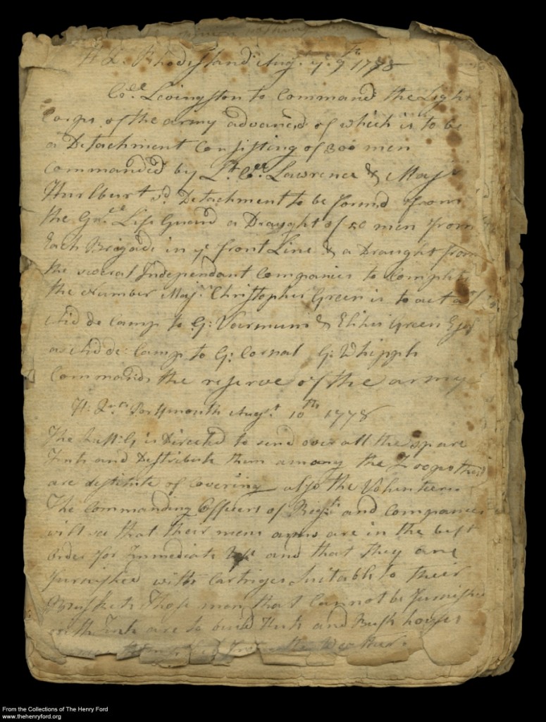 My special moment begins with me looking through a collection in our archives. I happened upon a paper book whose memory had been forgotten. Immediately drawn to it, I set about to see if I could discover its story. I began with the date and location on the first page. Not knowing the fragility of the rest of document, I did not want to open it up. The top of the book read “H.Q. Rhode Island, August 7-9, 1778. I recognized the “H.Q.” as an abbreviation for “Head Quarters” and that gave me a clue that this document was military related. The date and location helped paint a clearer picture by letting me know that this document was also most likely created during the Revolutionary War. Further research helped me identify this type of document as a military orderly book. A book kept by each Revolutionary War regiment that documented troop movements, military orders, troop pay, conflicts, and the day to day happenings of that regiment.