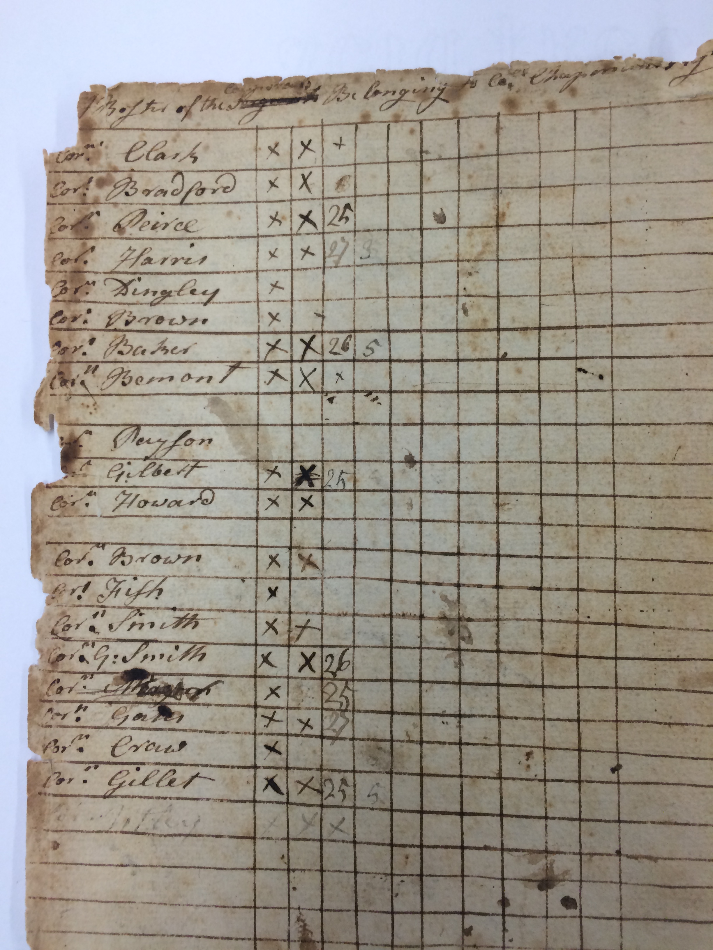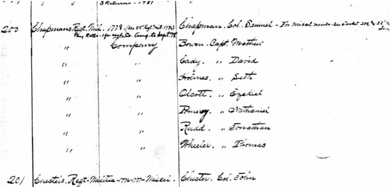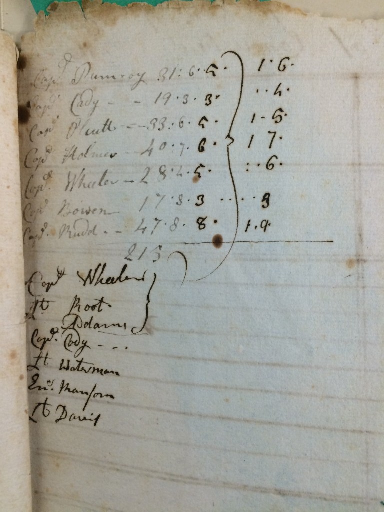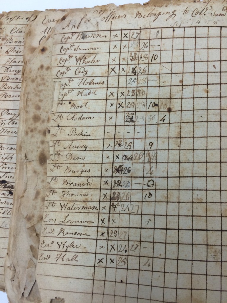 You can imagine my excitement when I began thinking that this orderly book might document the 1st Rhode Island Regiment’s first battle in the Revolutionary War. The dates, locations, and names all matched up. With this information, I decided that I needed to open the book and confirm whether my assumptions were true. While I struggled with the 18th century handwriting at first, I eventually made my way through the book and found three pages that contained lists of names for payroll. I ran these names through the “Revolutionary War Rolls, 1775-1783” available on Ancestry.com and was able to successfully identify the regiment to which this orderly book belonged.