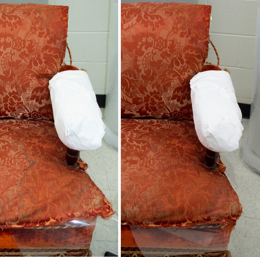 In August 2014, the metropolitan Detroit area experienced heavy rains and flooding, and several artifacts in Henry Ford Museum’s furniture display were damaged by water and debris. Two of the artifacts were upholstered, and required extensive conservation treatment to stabilize them and make them suitable for continued exhibit. A generous grant from The Americana Foundation enabled conservators to accomplish this work.