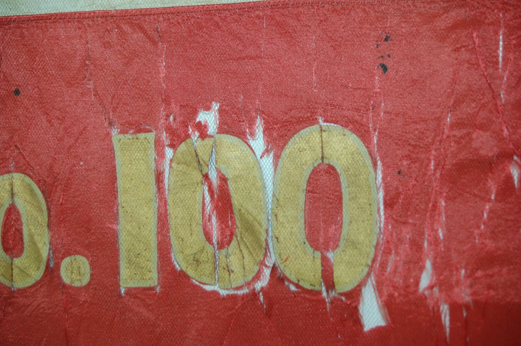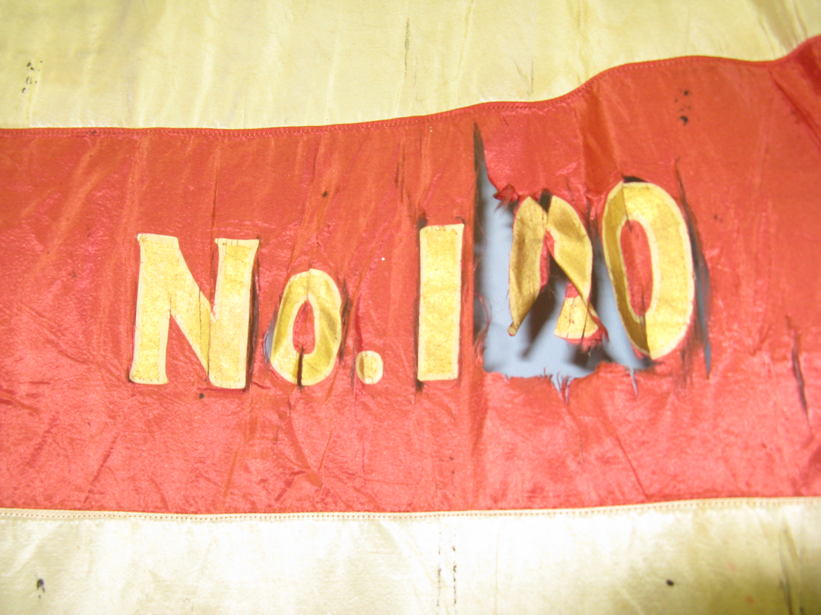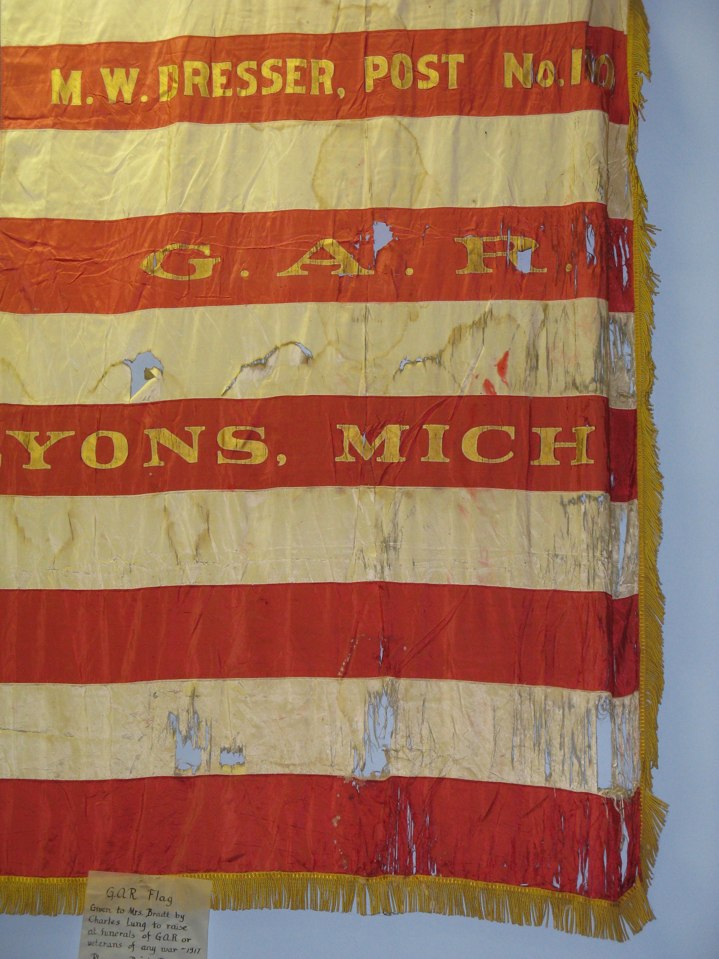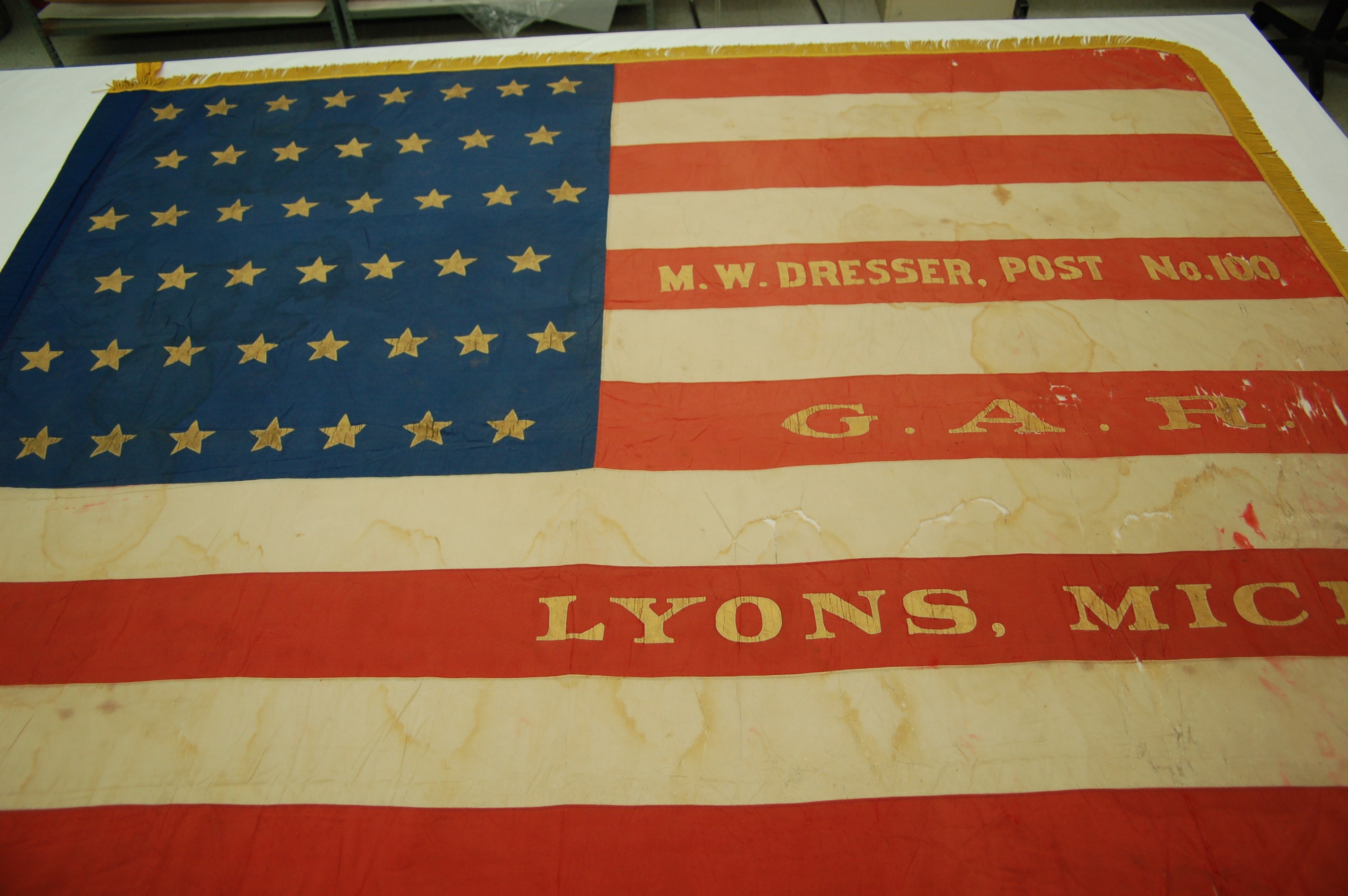 This flag dates from the end of the 19th century and was used by a G.A.R. post in Lyons, Michigan. The G.A.R. (Grand Army of the Republic) was a Union veterans’ organization formed after the Civil War and there were posts in almost every town in Michigan. This flag would have been used in parades on patriotic occasions in Lyons. In 1917 the flag was donated to the town “to raise at funerals of G.A.R. or veterans of any war.” It was displayed for many years in the Lyons-Muir Historical Museum. Its caretakers recognized the need to preserve it and brought it to Textile Conservator Fran Faile.