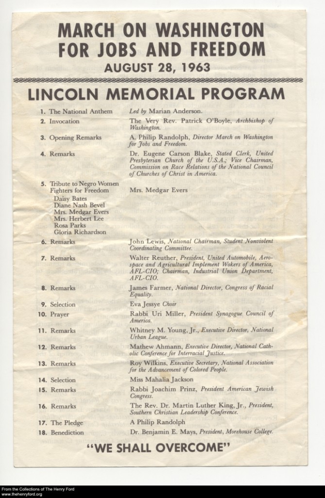 This program is a fascinating document of the day’s events. Speakers from each of the Civil Rights organizations who had helped plan the March offered remarks, as did labor leader Walter Reuther and members of Catholic, Protestant, and Jewish organizations. A “Tribute to Negro Women Fighters for Freedom” included Rosa Parks. After about two hours of speeches, King’s “I Have a Dream” speech ignited the hot, tired crowd. Then, A. Philip Randolph—the original instigator of the March—read the words of a pledge that the marchers were to agree to, raising their voices in the affirmative. The words of this pledge still ring with the hope and determination that defined that day 50 years ago. The following is an excerpt: