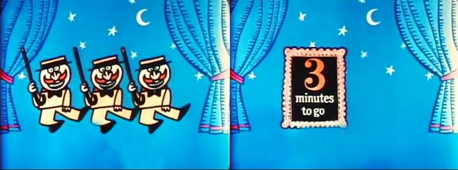 The film reel that Virgil is about to give to me is one such clock shell, beginning with the Hungry Martian, and followed by a unique version of Refreshment Time. The reel was produced by the animation department at the National Screen Service, a company that began in 1920 as a movie trailer production outfit, and in 1940 became the monopoly for poster distribution. The NSS also made intermission films, but suffered competition from companies like Filmack and Pike Studios, who specialized in the genre. The animation on the two snipes here is rumored to be by Jay Ward, animator of Rocky & Bullwinkle and designer of the Cap’n Crunch logo.
