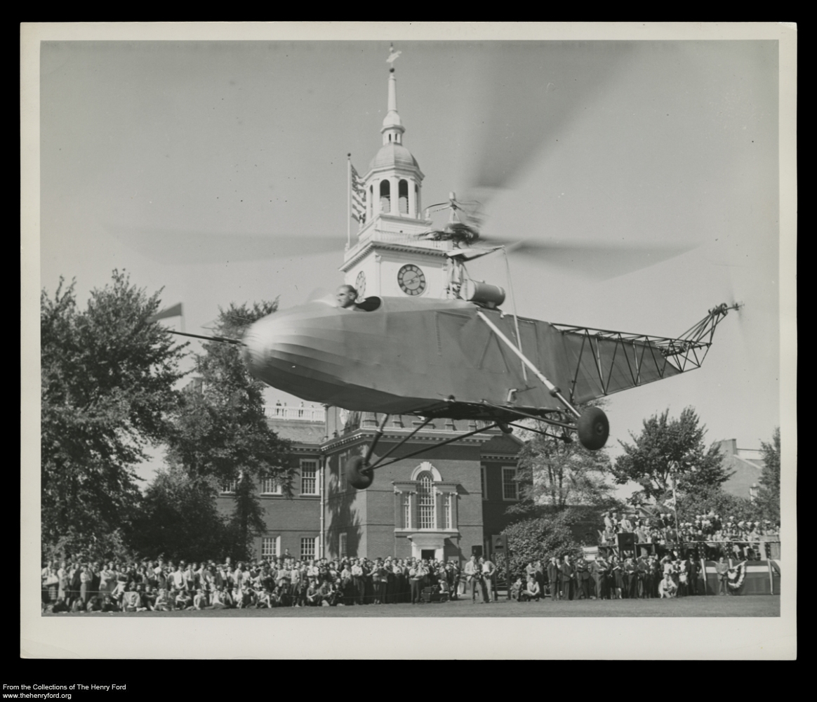 You may know that the Sikorsky VS-300A helicopter on display in Heroes of the Sky in the Henry Ford Museum was the first practical helicopter in the United States. Inventor Igor Sikorsky piloted this craft for about an hour and a half on May 6, 1941, setting a world endurance record. In 1943, as shown in this photograph, Sikorsky demonstrated the machine on the front lawn of the Henry Ford Museum just before donating it. Attendees at the event included Henry and Clara Ford, Henry Ford II, Charles Lindbergh, and Les Morris, Sikorsky’s chief test pilot. We’ve just digitized a number of photos related to the ceremony, Sikorsky, and helicopters in general—view them all in our digital collections.