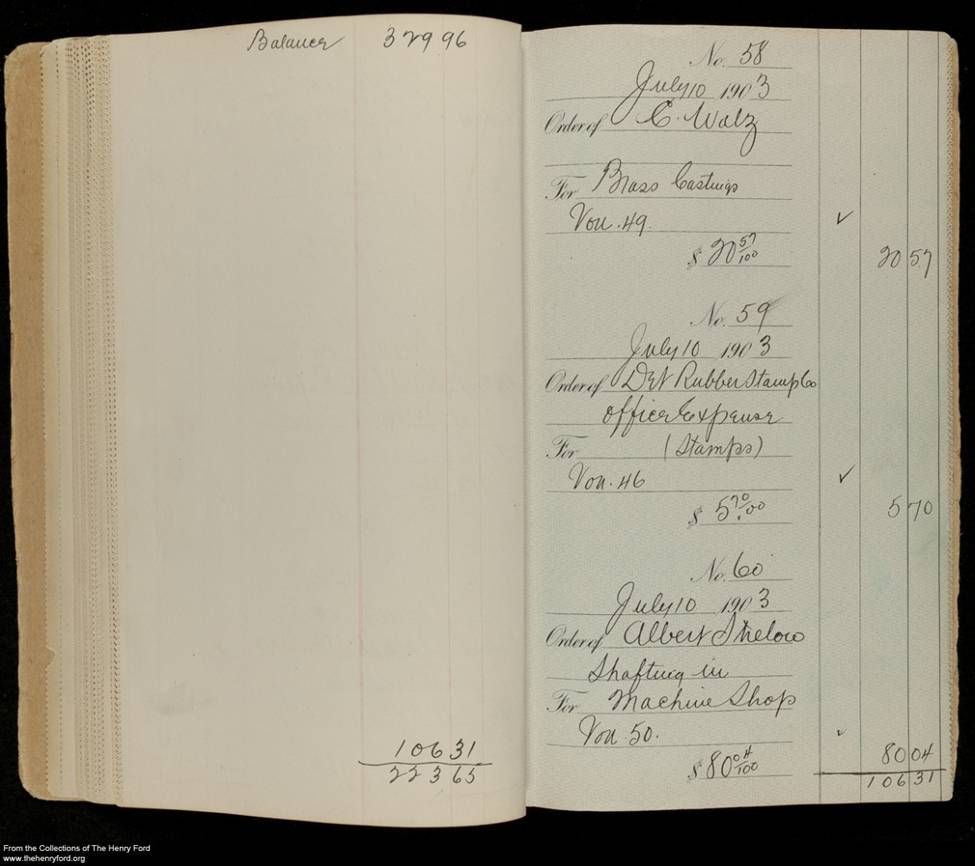 A number of objects selected live in our archival collections, which may be viewed via a visit to the Benson Ford Research Center. These include two-dimensional objects such as a photograph of the first Highland Park Ford assembly line and Ford Motor Company’s first checkbook.