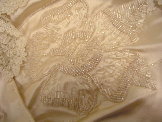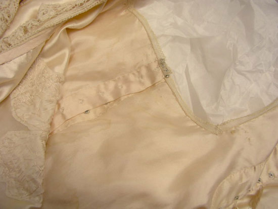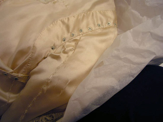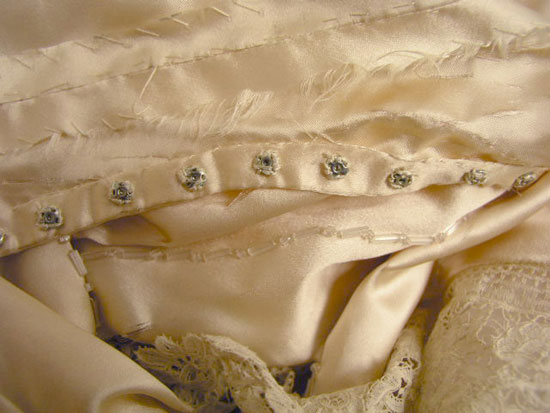 Close examination of Elizabeth Parke's 1921 silk satin wedding dress reveals that it is entirely hand sewn. This is surprising. Sewing machines were in use for decades and dressmakers would likely not have spent all that time sewing a dress entirely by hand—there's not much profit in that. Too, the quality of the handwork makes it apparent that the dress is not expertly sewn. The stitching is not quite as precise and consistent as we might expect a seamstress to produce. For example, seams are somewhat "finished" with overcast stitches so they won't unravel (but they are unraveling nonetheless). A seamstress might well have rolled or taped the edges of the fraying satin so that it would not entirely unravel. Similarly, red markings for glass bugle bead floral decoration are visible at close examination. A professional dressmaker probably would have ensured that these marks were minimized.