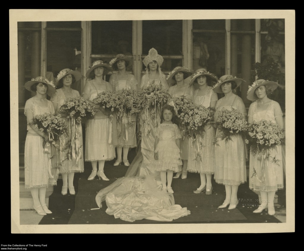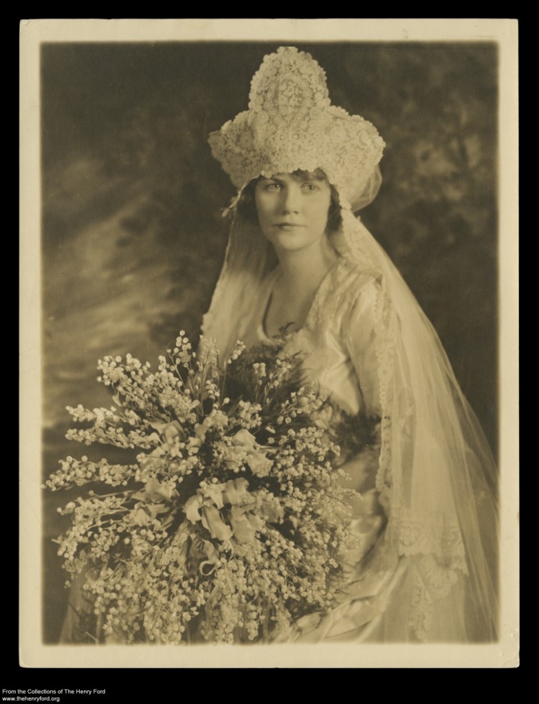 Firestone family members relate that Elizabeth designed and produced her own off-white silk satin wedding dress. This dress was a short-sleeved, short-skirted, "flapper" type wedding dress, with headdress inspired by Russian folk headpieces. By looking at this dress for clues, we might determine whether the wearer did indeed craft her own wedding gown.