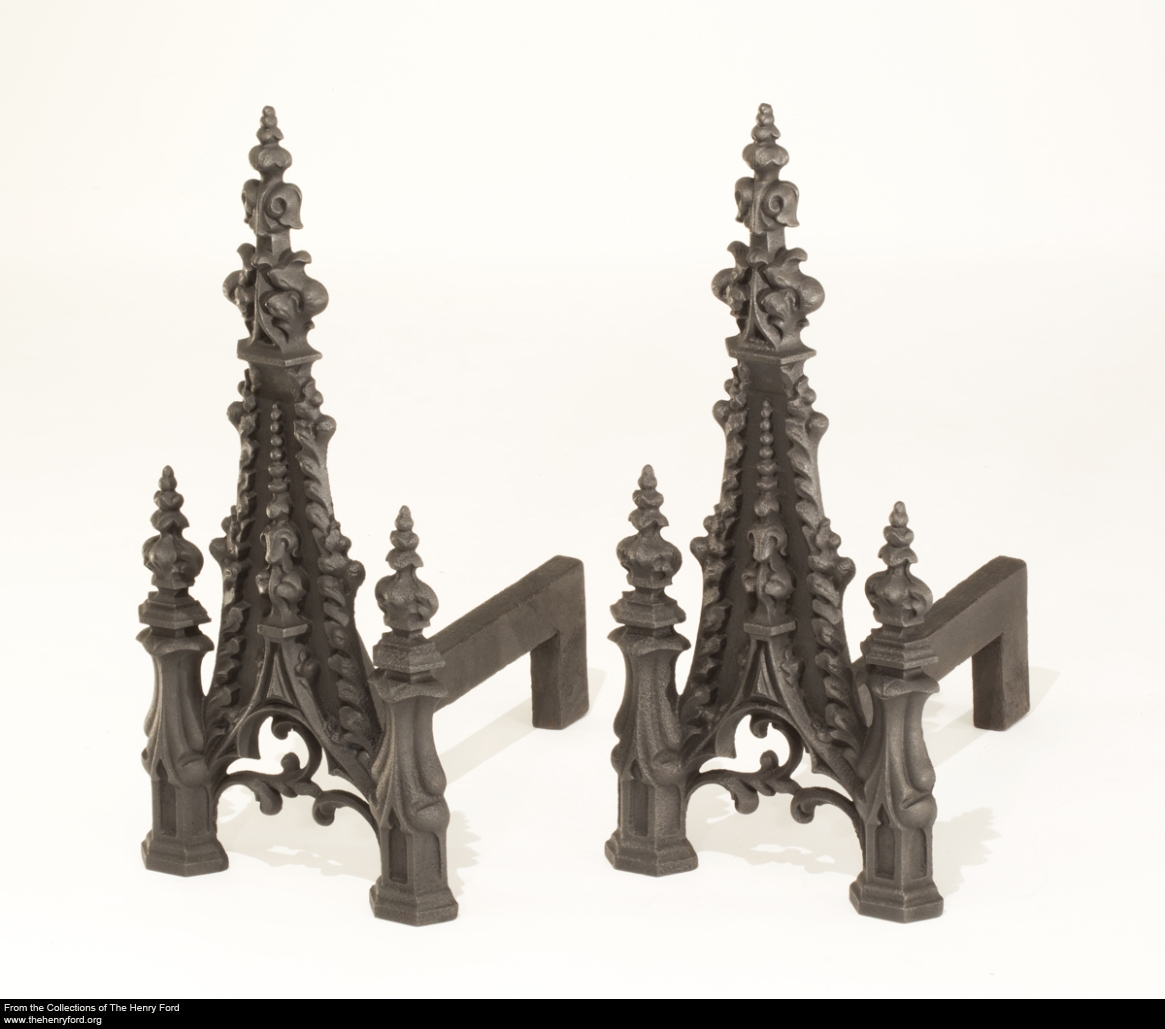 These tall cast iron andirons—with their double “stack” of church spires—are the very definition of the Gothic Revival. They appear to be lifted from a medieval cathedral—although nothing like them ever existed in the Middle Ages.