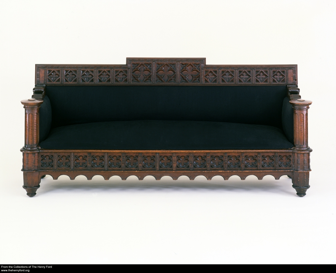 This elegant sofa is covered with quatrefoil carvings (a stylized four-part leaf design) derived from medieval stained glass windows. This massive, imposing piece was intended to make a fashion statement in a Victorian parlor.