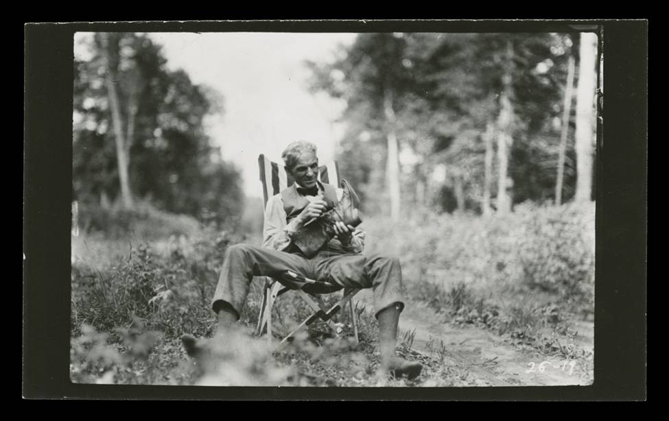 Henry Ford, lacing his boots during a camping trip, 1919 (THF96265).