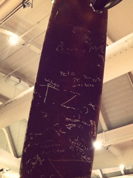 After later examination, I found that most of the names that were tagged with years occurred in the 1940’s and 1950’s. The year tags declined into the 1960’s and early 1970’s. Year tags don’t exist after those early 1970’s dates at all. So what do we have here? I would call it historical graffiti. While it is clearly vandalism and vandalism is strictly prohibited, it has existed for so long that we could now examine it as relevant. It documents the stories and memories of those who have visited The Henry Ford in the past. That’s an important realization when you want to think about the educational impact the museum has had over its long history.