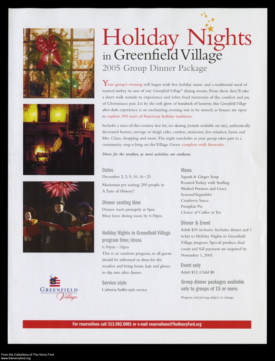 Does this sound more familiar? This dinner reservation form for Holiday Nights in 2005 offered holiday fun for groups of all sizes in Greenfield Village.