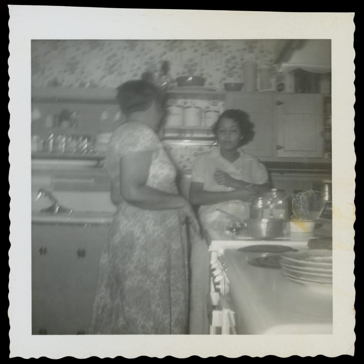 Juanita Sherrod (Richie Jean’s mother) and Richie Jean Jackson in the Jackson Home kitchen, Selma, Alabama, ca. 1959. The layout and features of the kitchen, small though it was, helped facilitate Richie Jean’s work. / THF708492