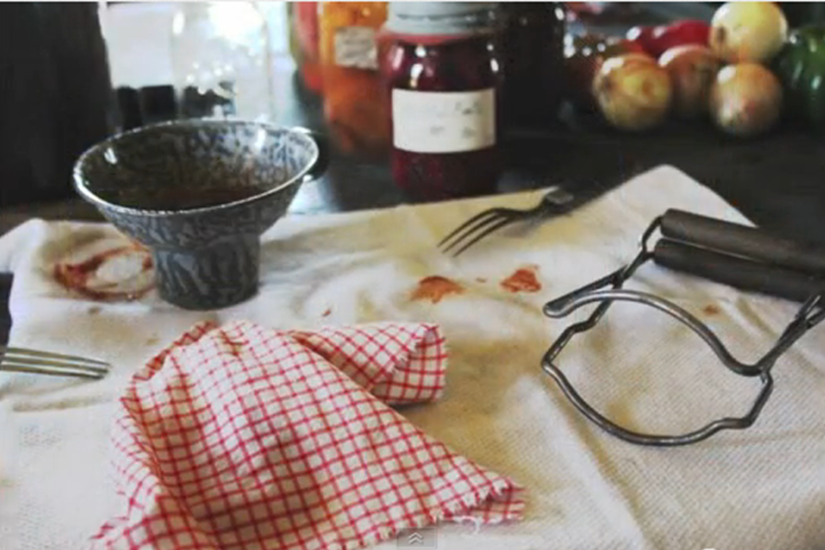 As you’ll see in the video, presenters Becky Goodenow and Larissa Fleishman start out by sterilizing the jars they’ll use for canning that day. You can’t touch the inside of the jar, as you might contaminate it, so a clean cloth is used to wipe it down. A metal spoon is most important because it helps disperse the heat from the hot liquid. This helps to prevent the cooler glass jar from cracking as you pour in the boiling liquid.