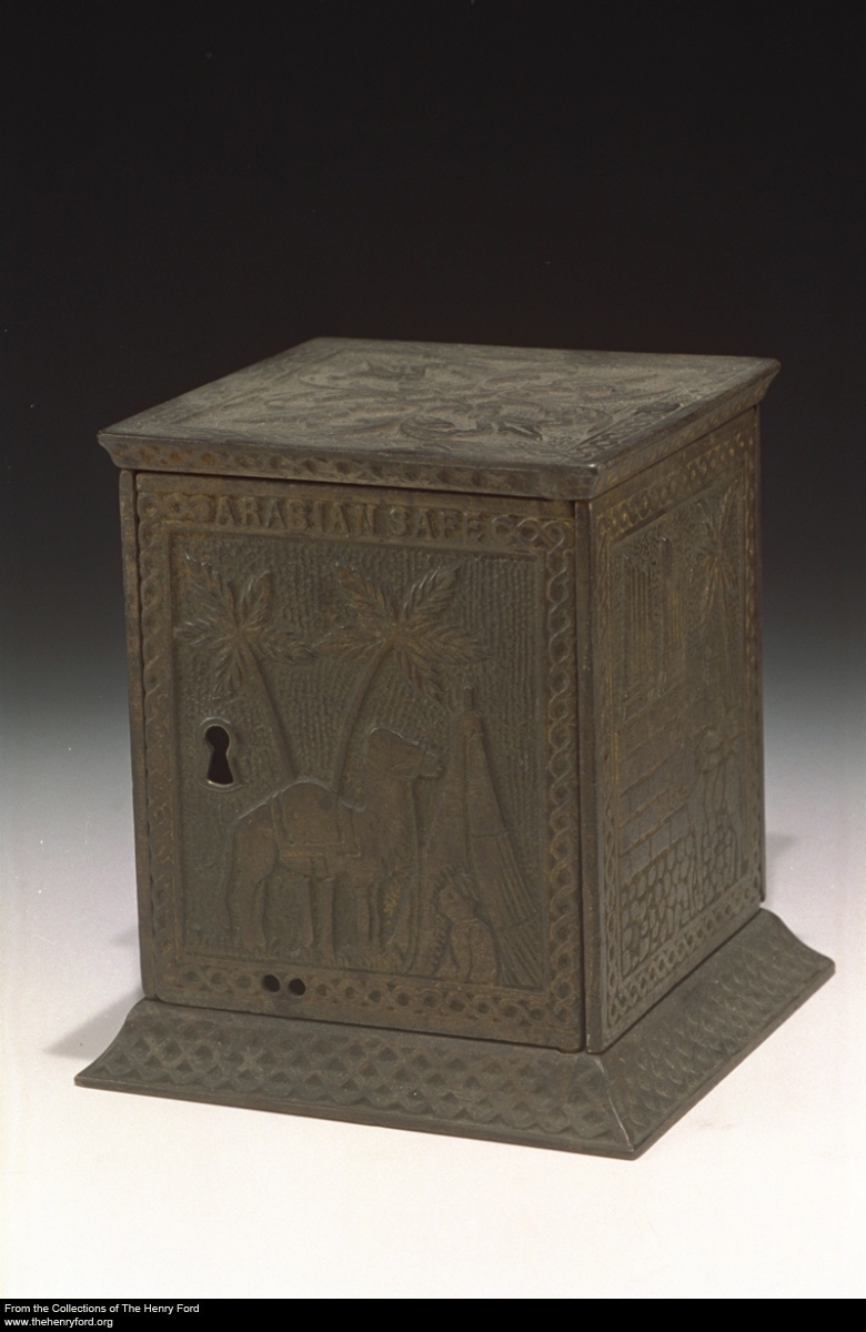 The Henry Ford has a number of banks in its collections, ranging from piggy banks to commemorative banks to corporate promotional giveaway banks to mechanical banks. We’ve just added some banks to our digital collections, bringing the total number available for browsing online to about three dozen. One of our most recent additions is this “Arabian Safe” bank from the late 19th or early 20th centuries, featuring exotic scenes of camels and palm trees. See this and other banks by visiting our digital collections.