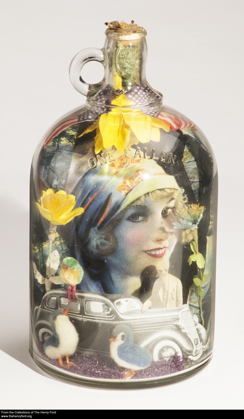 Henry Ford is sometimes referred to as a “folk hero”: he was such a prominent figure in public life during his day, and had such a significant impact on the entire world, that many people felt compelled to send him gifts to show their appreciation. Some of these are machine-made items, but many were laboriously hand-created. We’ve just digitized some staff favorite tributes to Henry from our collection, including this 1935 diorama created in a gallon jug and featuring Henry Ford, Ford V-8 automobiles, young women, flags, flowers, and cotton chicks. Check our blog later this week for a post from Collections Specialist Patrice Fisher highlighting more of these honorifics, or if you can’t wait, you can check out sets on our collections website related to love of Ford automobiles, likenesses of Henry Ford, and awards and trophies—or view all 70+ items.