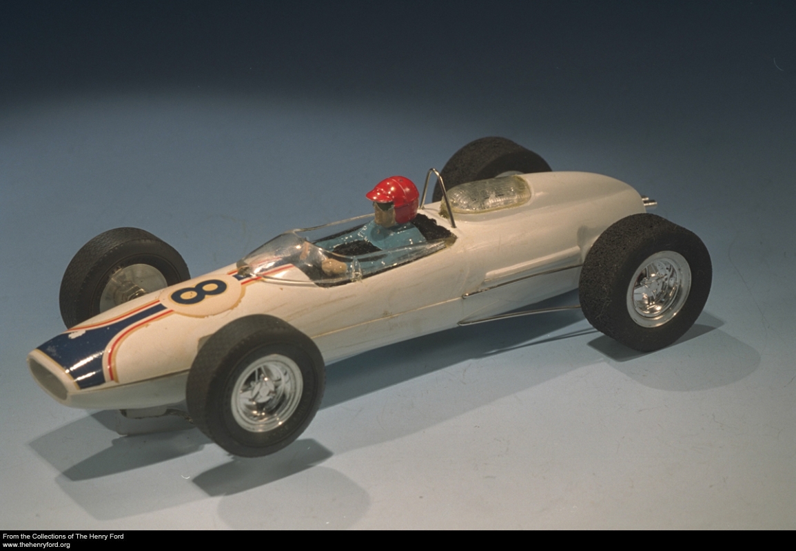 Toy automobiles have been around since the very early days of the automobile, though trends in these toys have changed over time. One category that reached a peak of popularity in the 1960s and 1970s is slot cars, scale vehicles run on a slotted track that both guides them and provides electrical current to power them. The Henry Ford received a donated collection in the early 1990s that contains about a dozen and a half slot cars, plus supplies, track pieces, and other accessories. We’re in the process of digitizing these, including this Indy slot car. Visit our collections website to view the remainder of the recent additions, and watch for more to come over upcoming weeks!