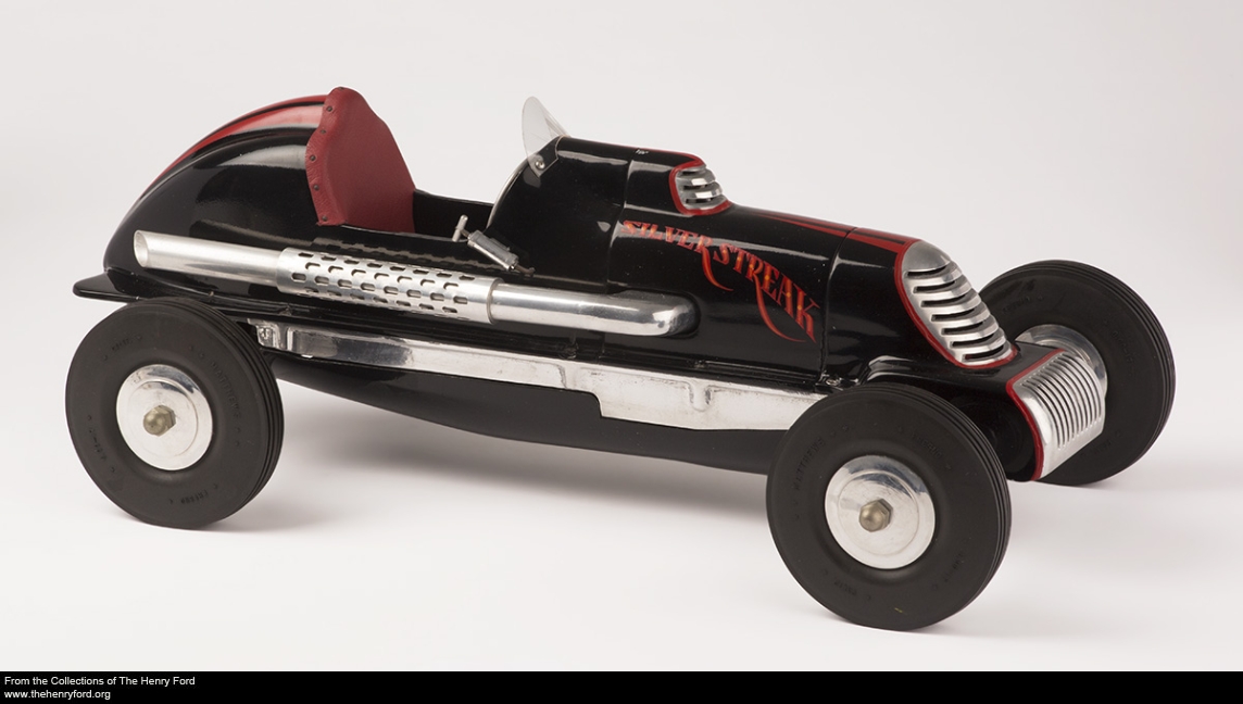 Back in June, we announced the digitization of selections from our collection of slot cars, model race cars most popular in the 1960s and 1970s. Recently, we’ve been digitizing a collection acquired last year of spindizzies, an earlier type of model race car. Spindizzies were popular in the 1930s and 1940s, incorporating model airplane engines powered by gasoline, and were either raced together on grooved tracks or tethered to a pole and run singly on circular tracks. Our new collection, donated by Eric Zausner and the E-Z Spindizzy Foundation, includes cars, tools, and accessories. You can now view a number of these, including this 1939 “Silver Streak” model, in our Digital Collections. Check out all the cars and accessories we’ve digitized from this collection so far, and keep watching as we add more over coming months.