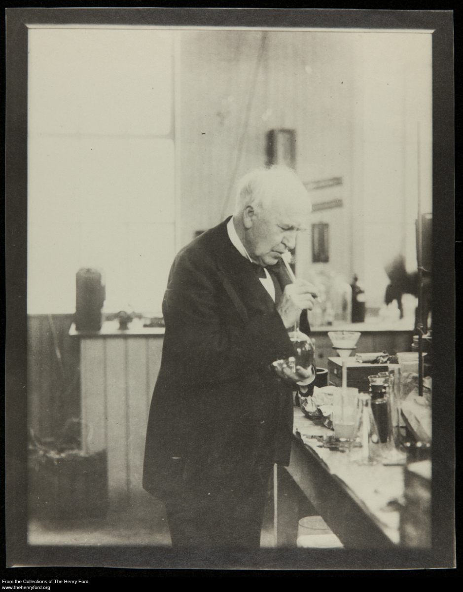 The admiration Henry Ford held for his friend Thomas Edison has deeply shaped Henry Ford Museum and Greenfield Village, as evidenced today through the cornerstone in the Museum and through more than a half-dozen buildings related to Edison’s life and work in Greenfield Village. We’ve just digitized a number of photos of Edison to bring the total number of our Edison-related collections objects online to nearly 250, with a few more coming soon. Visit our collections site to see this photo of Edison in his West Orange lab in 1920, as well other recently added photos of the inveterate tinkerer analyzing things such as dictating machines, telegraph keys, and even an electric streetcar.