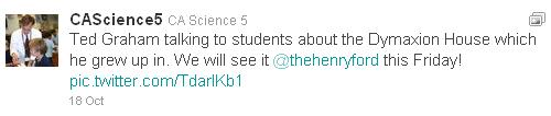 It turns out that Robby Simpson, a fifth-grade science teacher at Columbus Academy in Columbus, Ohio, and his school have been bringing students to The Henry Ford for the Great American Museum Experience (G.A.M.E.) program for years, and they always enjoyed the Dymaxion House exhibit. As it turns out, Ted Graham's daughter began attending Columbus Academy recently, and last week he offered to come talk to the fifth graders about his experience growing up in such a remarkable building before they made their trip to Dearborn to see the real thing.