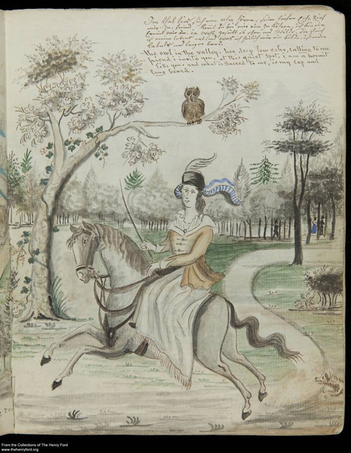 Upon seeing the album, my first reaction, after delighting in its bright colors and charm that are lost in reproductions, was to query, what is this object? Why did this folk artist make it? How does it relate to the rest of his work? Kathryn Barush undertook the identification of all the texts that filled the sketchbook, English and German. That was the first breakthrough in terms of understanding the breadth of Miller’s literary appetite: William Cullen Bryant, Shakespeare, Martin Luther--a miscellany of poems, fiction, and travel literature as well as botanical lists. Then the images, once analyzed, compared and decoded, revealed a wealth of pictorial sources that drew from newspapers, magazines and again, travel literature. Miller was not the naive folk artist we took him to be, but rather a man of his times, and his works were an omnium-gatherum of visual culture.