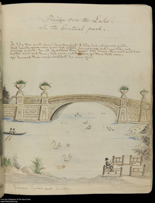 When the opportunity arose to write an online article for Nineteenth-Century Art Worldwide, my colleagues, Kathryn Barush, Emily Pugh, and I immediately saw that Miller, whose large body of work had not been seriously studied in almost fifty years, was an ideal topic. The Dearborn album is a guide to Central Park, the greatest public urban park in America. It offered a focused entry into both Miller’s worldview and into the study of the most important landscape undertaking of the nineteenth century, New York City's first public park. The 54 leaves are filled with watercolors of the park’s earliest features and structures and inscribed with English and German poems and commentary.
