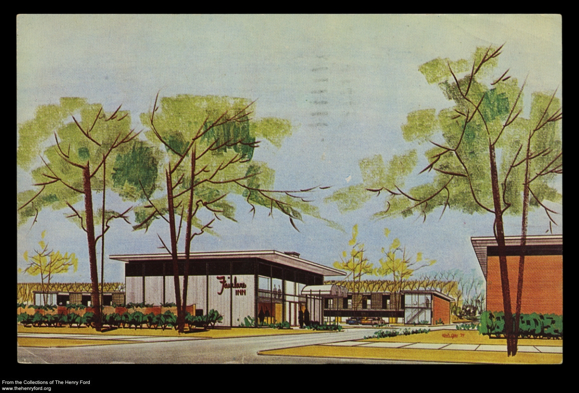 Dearborn’s Fairlane Inn, depicted here on a circa 1960 postcard, was home to the clandestine meetings that launched the Mustang. (Object ID: 2014.6.1)