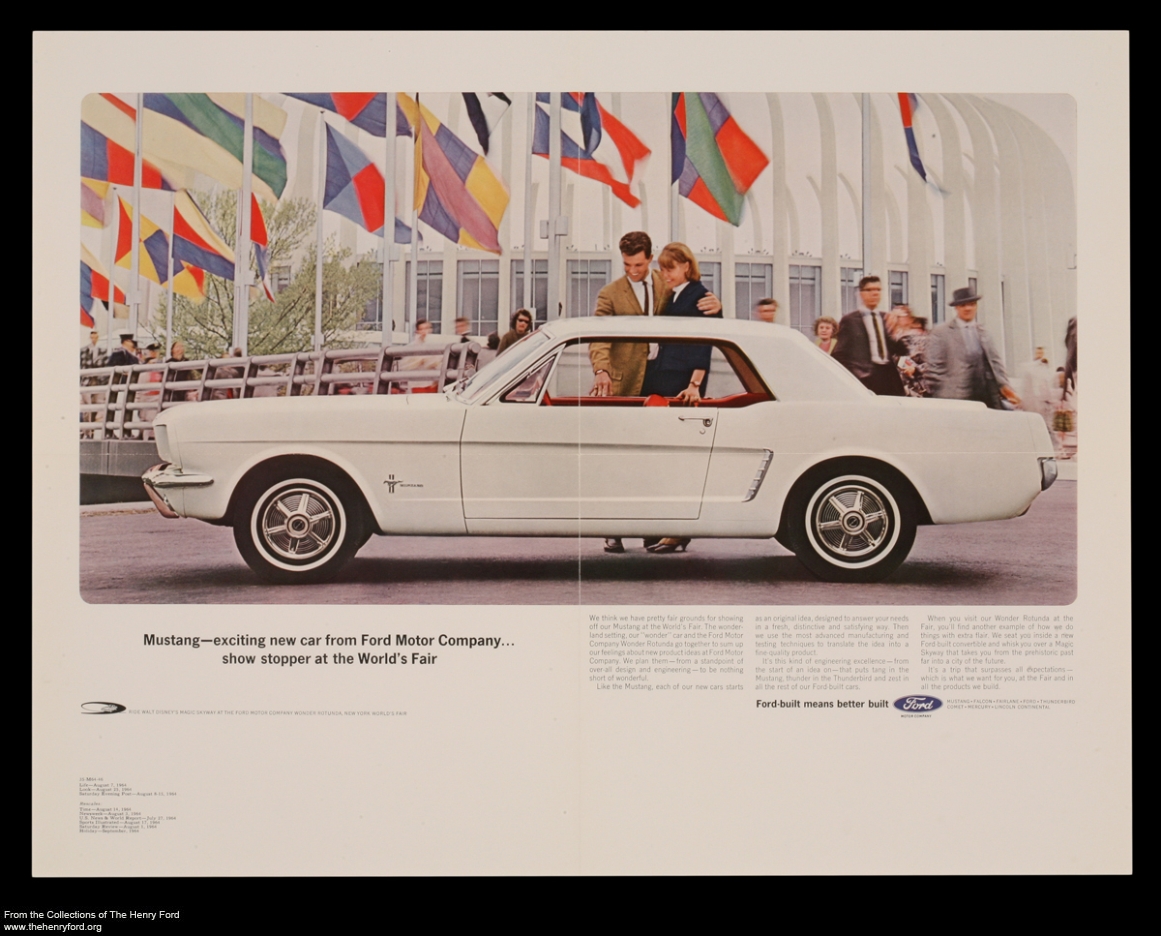The Mustang, “show stopper at the World’s Fair.” By premiering its new car at the fair, Ford ensured maximum publicity. (Object ID: 64.167.19.522)