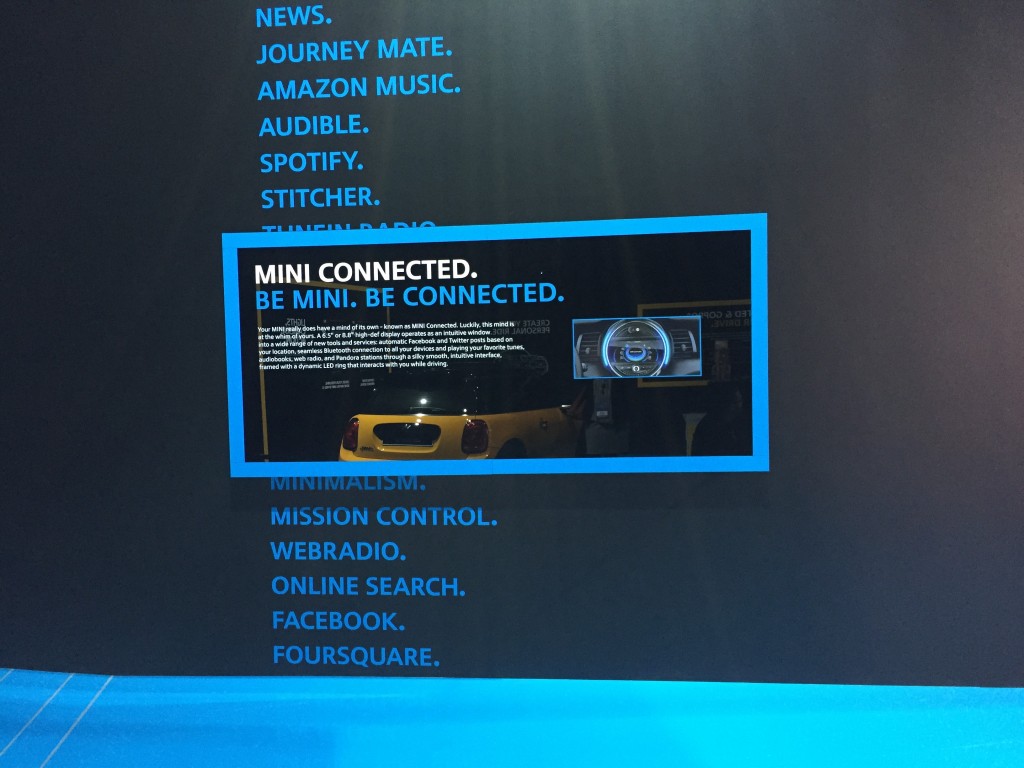 The MINI exhibit was likely the most explicit in its outreach to interconnected generations with its “Mini Connected” models on view. Integrated streaming and satellite radio services aside (with several new standards like Spotify and Amazon Music), this car is also outfitted with high definition GoPro cameras. These cameras allow videos and photos to be automatically uploaded to social media platforms like Facebook and Twitter. If younger generations live with and through screens; the MINI Connected provides the tools to capture everyday life, the romance of the roadtrip—and perhaps occasionally footage never meant to be shared with the world.