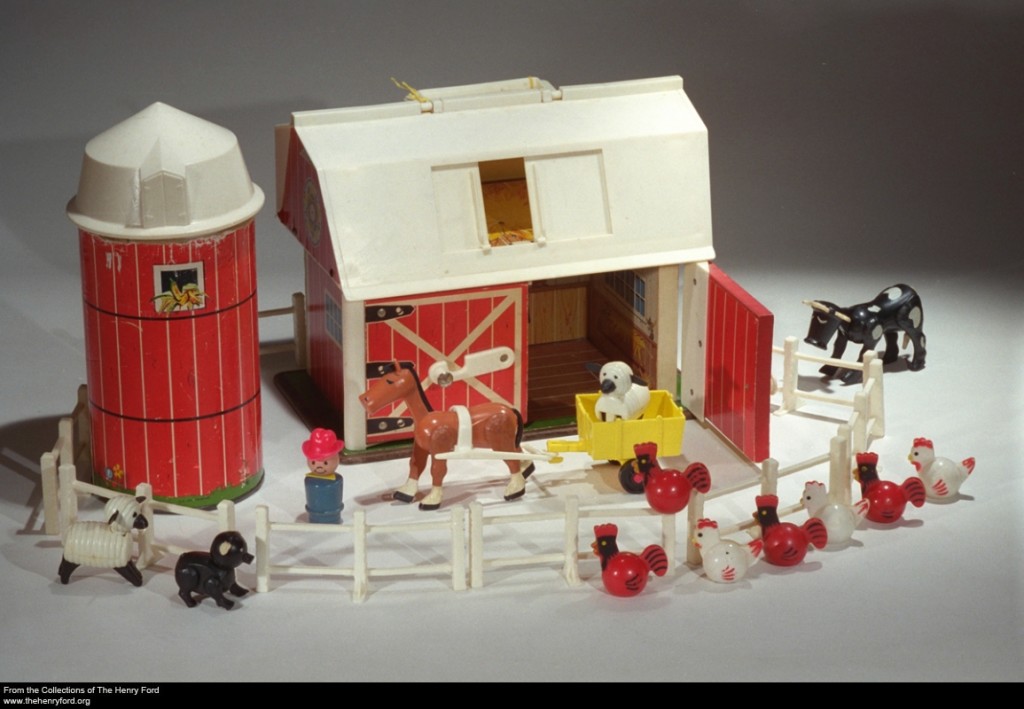 Often play sets were miniaturized sets of household items, like dishes and kitchen appliances, or real-life settings like farms or circuses. The "Play Family Farm" (Fisher-Price #915) has been produced continually since 1968. When the barn door is open, a mooing sound can be heard. The silo is designed for storing accessories.