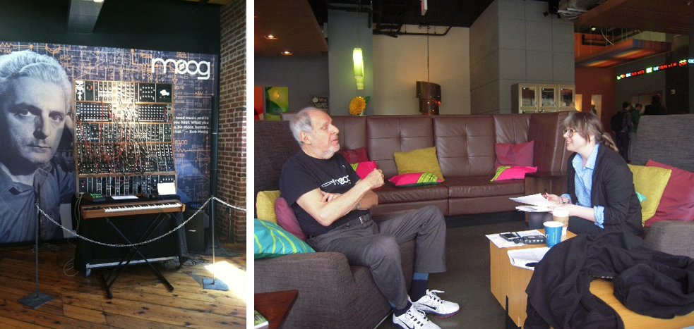 The new Emerson Moog Modular System, unveiled at the Moog Factory (left); Herbert Deutsch and Kristen Gallerneaux talk about all things Moog (right).