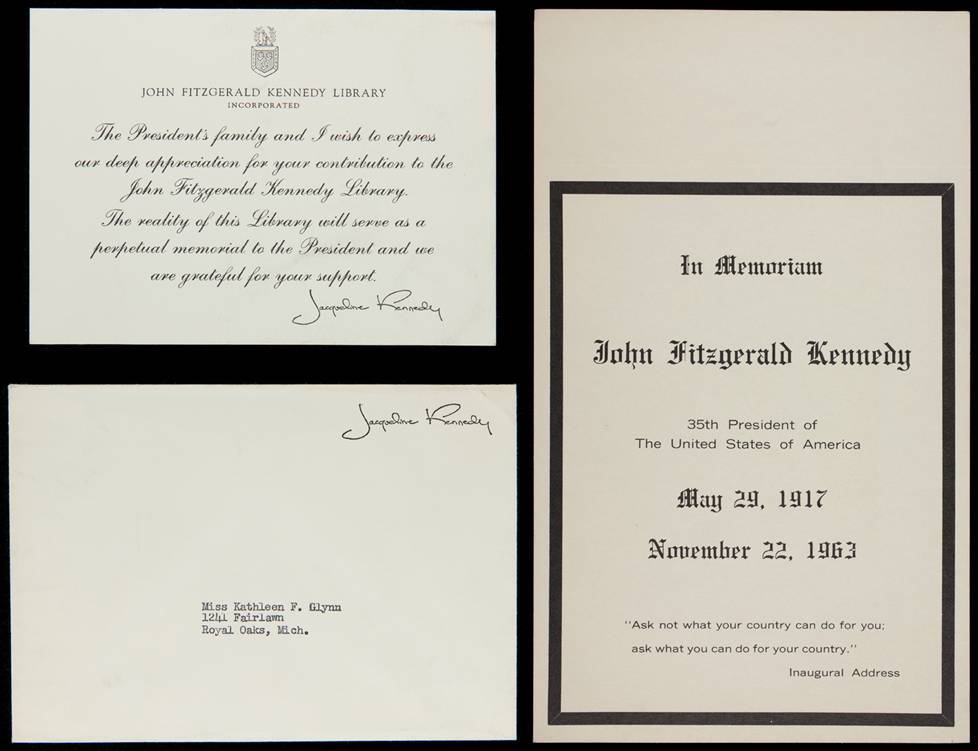 They gathered and carefully preserved dozens of memorials surrounding President Kennedy's life and death. Kathy Glynn, then a high school student, gave her hard-earned savings to the John Fitzgerald Kennedy Library in honor of the president. She received a thank-you card from Jacqueline Kennedy and carefully kept the card and the envelope. In addition to feeling many strong emotions about receiving this card, she recalls being astonished that the U.S. Postal Service accepted Mrs. Kennedy's engraved signature in place of a postage stamp. These small pieces of paper held much personal meaning for Kathy.