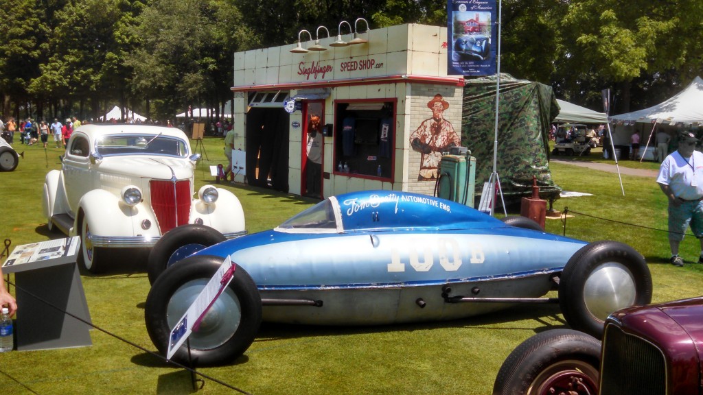 Far and away, the most unusual automobile in the show was a replica of one of the three Dymaxion Cars designed and built by Buckminster Fuller in 1933-1934. (Yes, the same fellow behind the Dymaxion House.) That streamlined body was exceptionally aerodynamic and the front-wheel drive car was capable of 90 miles per hour. But the rear-wheel steering (one wheel, at that) made the car frighteningly unstable at anything above 35. The replica is owned by Nashville’s Lane Motor Museum.