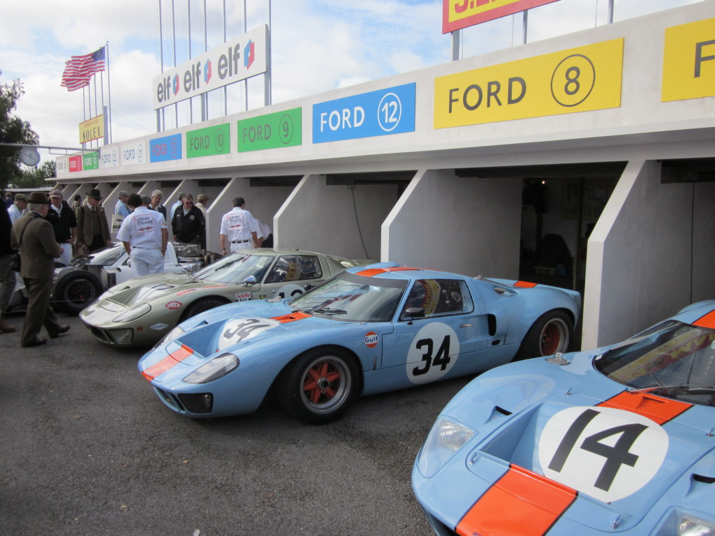 Significant though it was, the Jim Clark program was only one element at this year’s revival. Of particular interest to me was the 50th anniversary celebration of Ford’s GT40. Goodwood brought together 40 such cars, 27 of which competed in a 45-minute race complete with a mid-contest driver change. The GT40 dominated Le Mans in the late 1960s, and Goodwood’s collection included chassis #1046, the car that won the 1966 24-hour and started Ford’s reign. Appropriately enough, Goodwood displayed #1046 and several of its siblings in a recreation of the Le Mans pit building where they looked right at home.