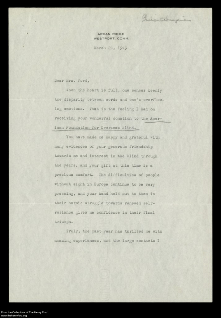 During a recent research project, I came across a letter from Helen Keller to Clara Ford, dated March 29, 1949, written two years after Henry's death. In the letter, Helen Keller (1880-1968) thanks Clara for her donation to the American Foundation for Overseas Blind. The Fords, Henry and Clara, as well as Edsel, had begun in the 1920s to donate to causes led by Helen Keller. Ford Motor Company's job training and placement for blind workers was one of the catalysts that began their association.