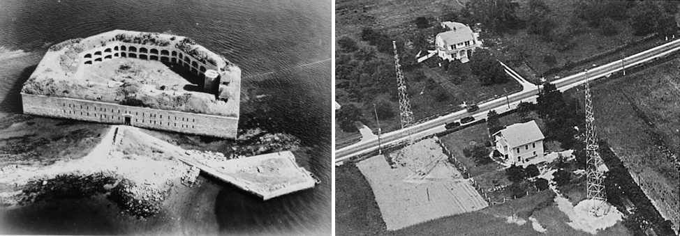The remote nature of these obsolete military strongholds summons to mind a photograph I recently found of the laboratory and home of Charles Francis Jenkins. An aerial view of Jenkins’s property, five miles north of Washington, DC, shows a flat sweeping field bisected by a dirt road. On one side of the lane, a domesticated gabled house; on the other, a simple building, built in 1921, house-like but clear in its utilitarian intent. The building is locked into its own kind of triangulation, solitary and yet an essential part of a whole, anchored between two soaring communications towers. This structure is the Jenkins Radiomovie Broadcast Station, the first station to be granted an experimental television license – a modest hub that had grand designs to broadcast outwards into the world.