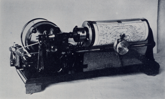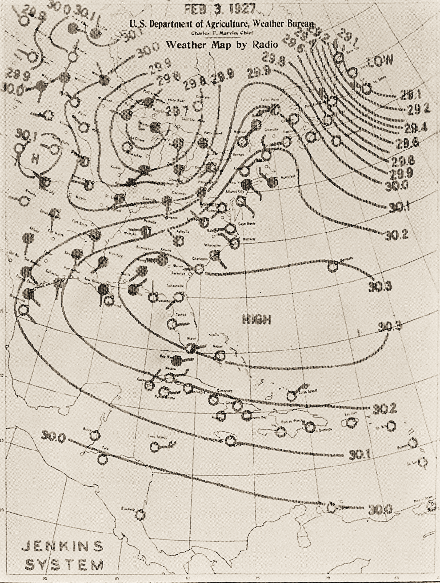 The sea continued to find Jenkins. In July of 1926, the Navy, Weather Bureau, and a group of ship captains gathered in Jenkins’s laboratory to discuss the development of an experimental weather map service using radiofacsimile. Jenkins was a fast worker, and by August, a prototype was in hand and ready to test. The transmitter consisted of a motor-rotated glass cylinder, with a printed map wrapped around its circumference. The idea was that, hour by hour, on board the ship, “after the usual code announcement, the radio man would hear: ‘Stand by for a weather map’ […] In a few minutes a weather map in red ink on the brown printed based map would be ready to hand to the captain of the ship.” The first map was telecast in this way on August 18, 1926, and Jenkins became the father of marine facsimile.
