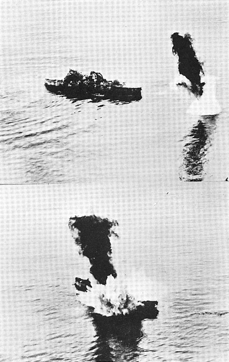 10,000 pound bomb of TNT, dropped on battleship from plane flying two miles high; a miss (above) and a hit (below).