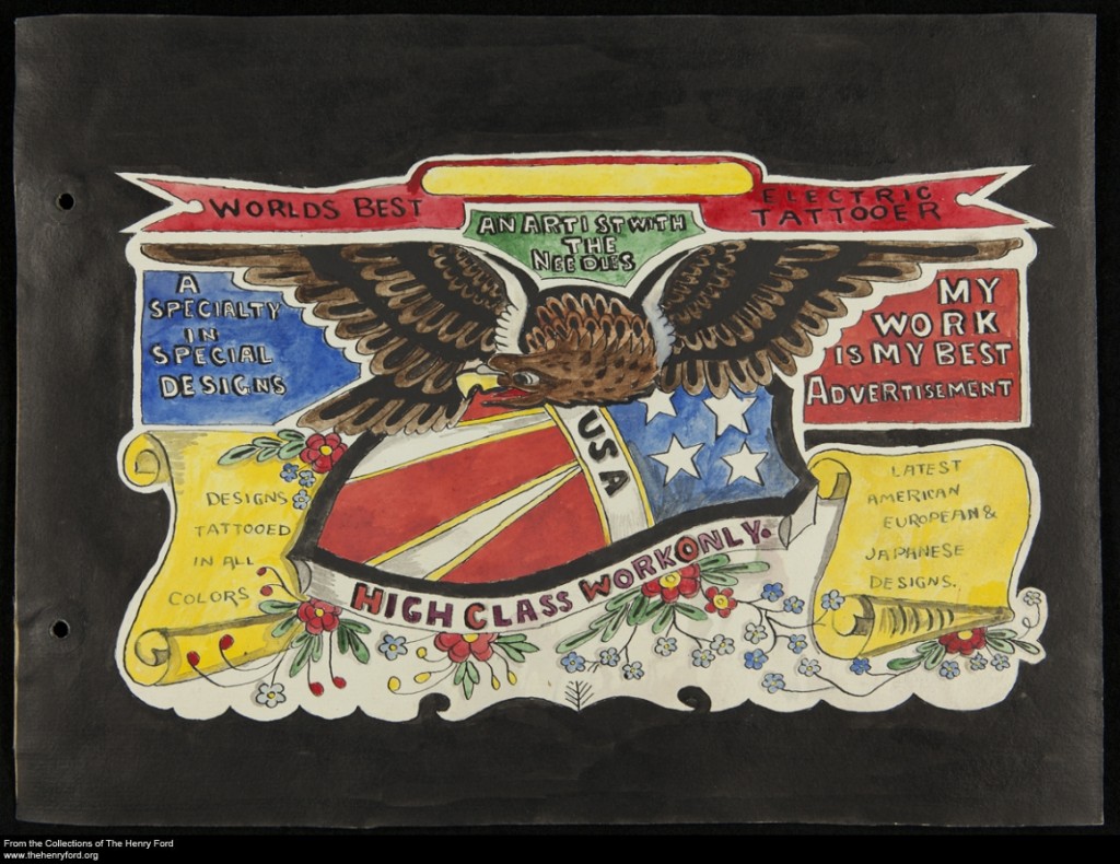 His illustrated business card proclaimed that he did “High Class Work Only,” and as “An Artist with the Needles,” was the “World’s Best Electric Tattooer.” Waters’ hand inked up famous painted ladies and men including Mrs. Ted Hamilton, Shelly Kemp, Red Van, and Detroit Dutch. “Mrs. Ted,” or, Pearl Hamilton, was a carnival circuit performer in the 1920s, and sported a show-stopping peacock tattoo on her back by the hand of Waters. Her risqué backless dress allowed carnival visitors to observe her designs, and the most intrigued patrons could then proceed to visit her husband, awaiting in the next tent with his own portable tattoo studio. With extended bodily canvases of circus performers and more demurely painted customers roaming the world to prove it, Waters claim that “My Work is my Best Advertisement” was seen far and wide.