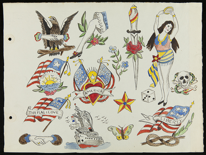Motifs found in Waters’ sketchbook continue to be used today. There are intricate floral and heart designs, portraits of exotic ladies (both tasteful and risqué), sailing ships, fraternal markings, badly rendered cartoon characters, and good luck symbols. There are Biblical characters and staid Native Americans representing strength and perseverance. Some evoke nostalgia: “rough riders” and cowgirls are tough, independent characters, yet speak to the romance of freedom, and of riding the range. Mythological and symbolic real-world animals appear on their own, intertwine in battle, or weave through skulls: snakes, panthers, roosters, mermaids, and dragons. Disembodied hands shake—a traditional symbol of honesty and friendship. And there is the truly bizarre: a shoe with a woman’s head on it, peculiar monsters, disembodied eyes, skeleton kings, and mosquitos landed on the skin.