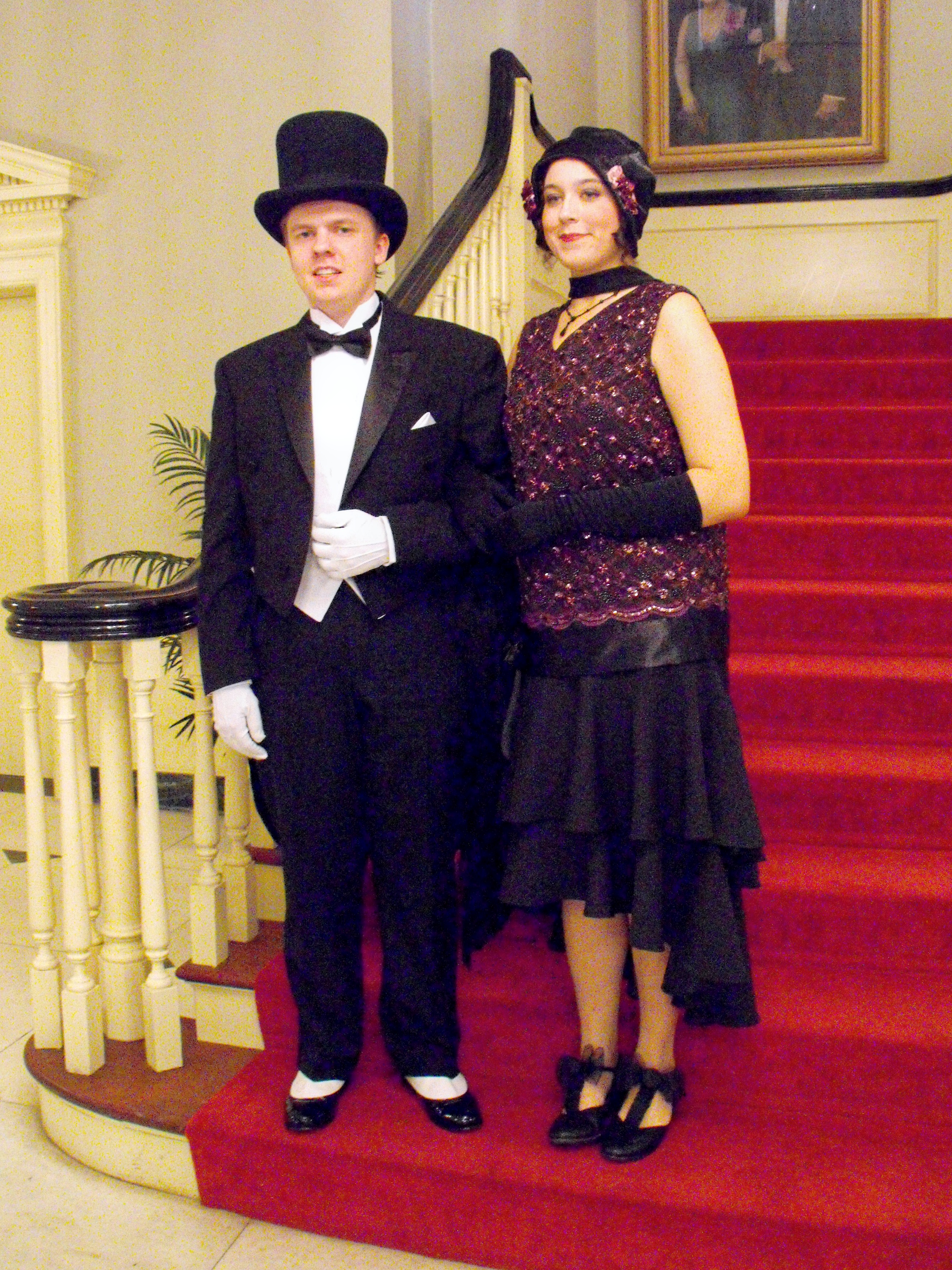Since men’s formal wear has generally changed little in over a hundred years, male dancers were elegantly dressed in a mix of black tuxedo styles which were appropriate for that era and remain stylish today. For formal occasions in the 1920s, men wore their tuxedos with white gloves and (when outdoors) top hats or even bowler hats. Special classically inspired touches such as suspenders, French cuffs with cufflinks and shoe spats helped to create an authentic look for each of our gentleman dancers.