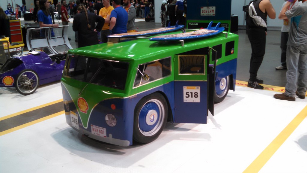 Walking around Cobo Center, I saw a remarkable variety of designs – some of which would stand up against anything a major manufacturer might build. While the Prototypes were all sleek and slender, I think I preferred the Urban Concepts. Students let their imaginations run wild, often using production vehicles as models. (I saw a couple of Volkswagen van homages – one complete with Scooby Doo in the rear window.) But the inspection process was serious business. Officials reviewed every car to confirm that fire extinguishers were aboard, that drivers could escape unassisted in ten seconds or less, that engine noise levels were within tolerable limits, and any number of other requirements. More than a few teams failed to make it past this step.