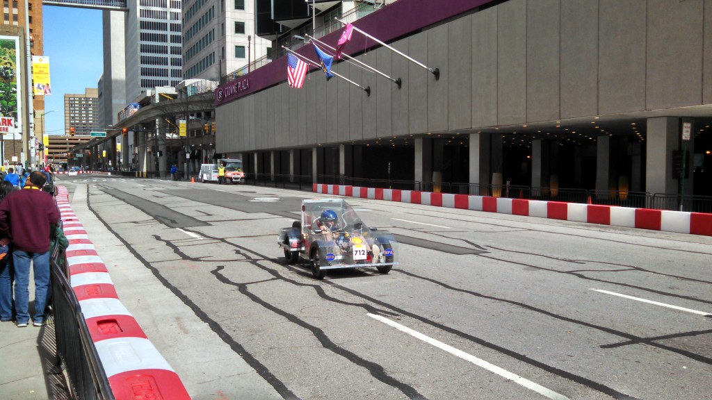 Those that qualified for the track faced a new set of challenges. The 0.9 mile course included a long climb up Woodward Avenue and a section of brick surface around Campus Martius. Each car had to complete seven laps – 6.3 miles – within 25 minutes, meaning that each car had to average around 15 miles per hour. That may not sound fast, but when you’re strapped into a lightweight, hand-built chassis with your backside just inches from the ground, it’s surely fast enough.