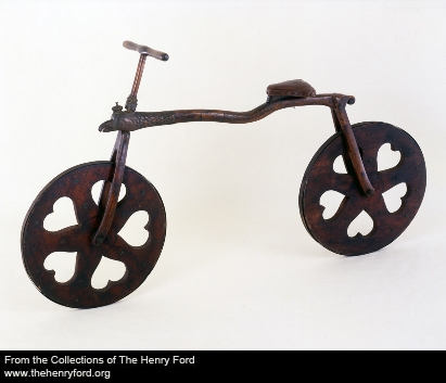 Postcard - "Band Stand over Lagoon, Belle Isle, Detroit, Mich.," circa 1915, Valentine-Souvenir Co. ID THF99105 / 87.9.23.50I think that any search for Valentine's Day cards needs to include heart shapes as a design motif. In addition to the cards, I expected to find jewelry, dishes and quilts to have heart motifs, but here's something unexpected: a forerunner of the bicycle made with heart shapes cut out of the wooden wheels.