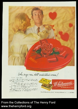 Velocipede, Draisine, attributed to a German maker, circa 1818. German Baron Karl von Drais invented the Draisine in 1817. Operators of this human-powered vehicle sat astride the wooden rail and pushed off with their feet. This early velocipede or hobby horse can be said to be the first bicycle. THF108100 / 32.161.1What would Valentine's Day be without a box of chocolates? This 1950s magazine advertisement says it all. Happy Valentine's Day!