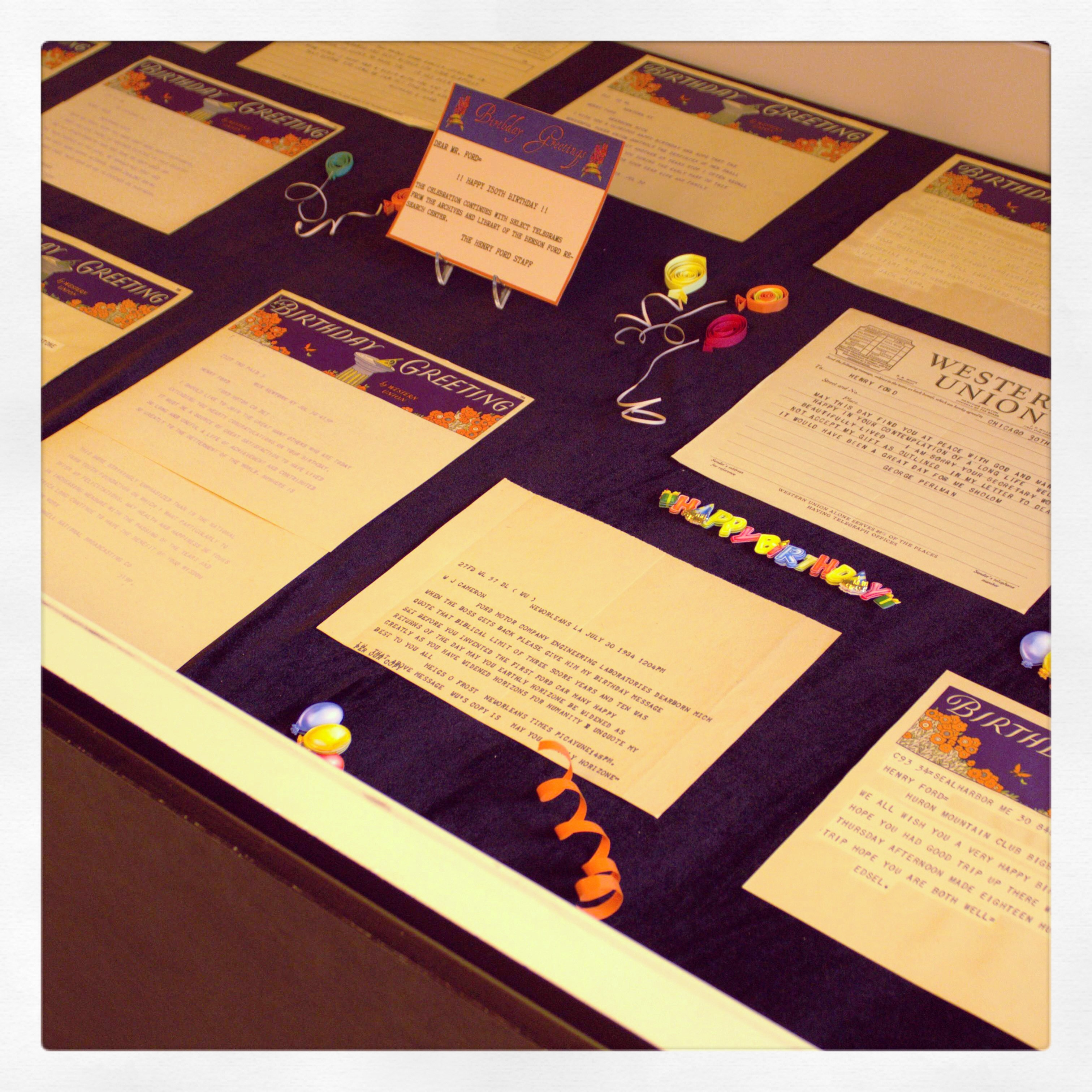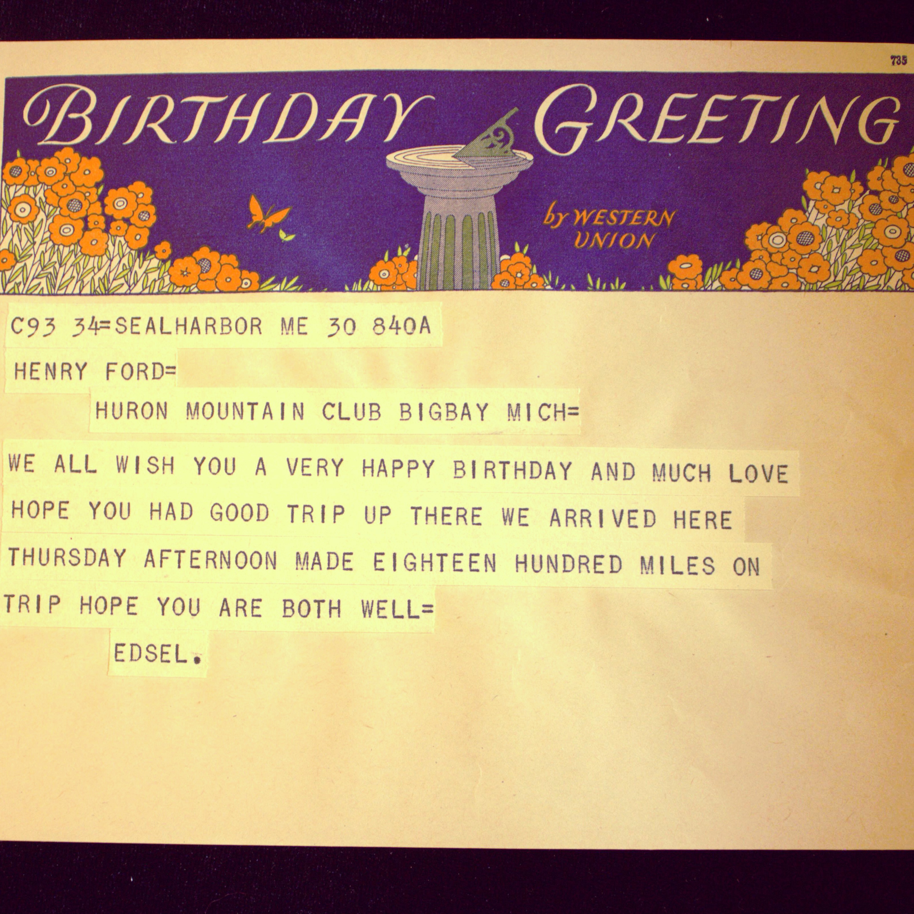 Located outside of the Benson Ford Research Center's reading room the past few weeks has been a case of birthday telegrams sent to Henry Ford on his birthday over the years. We asked Jake Hildebrandt, reading room assistant, a few questions about the telegrams in anticipation of Henry's birthday.